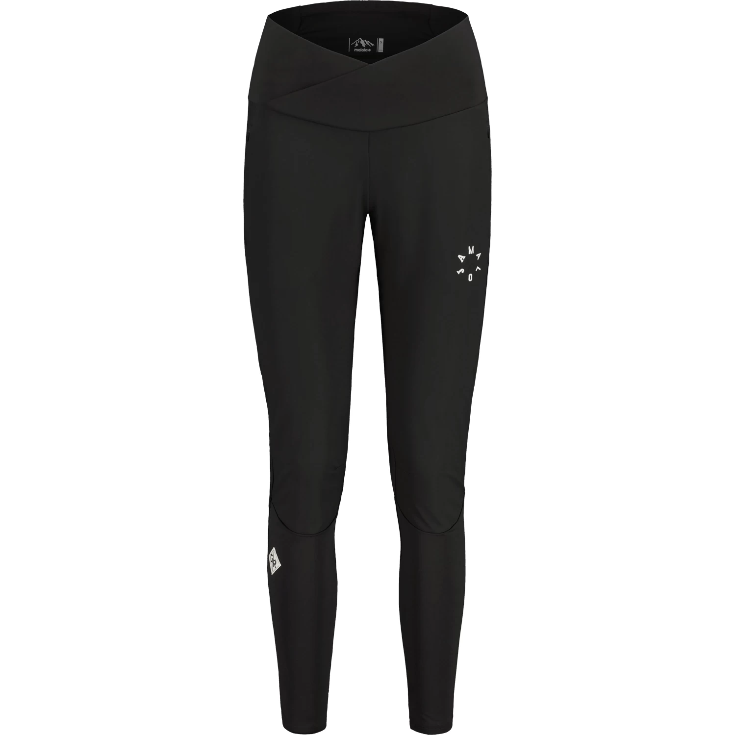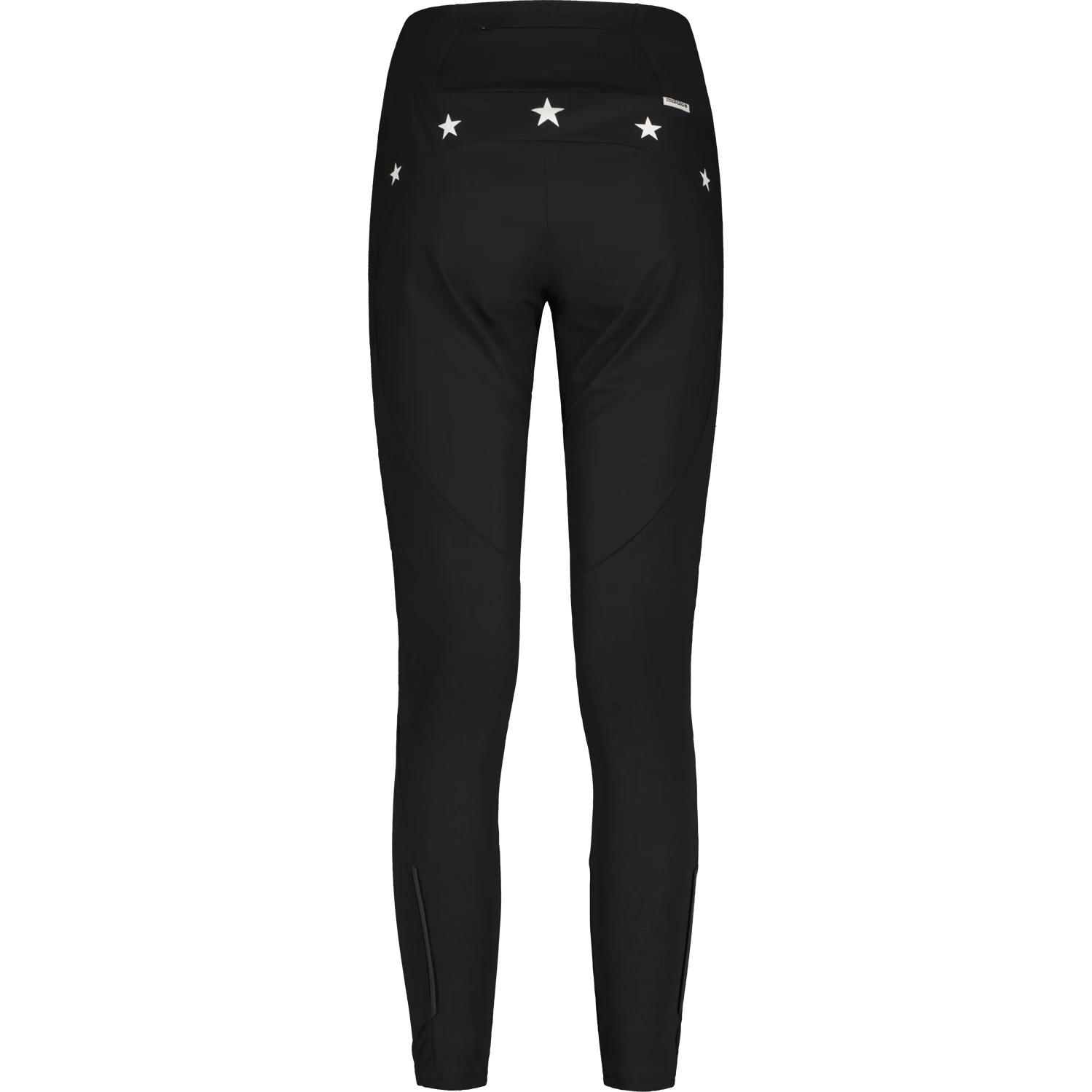 Zwei seitliche Zipper-Taschen und eine Smartphone-Tasche, Sterne über den Po, runder Maloja-Schriftzug über der linken Tasche, Glide&Ride-Patch an der Wade.