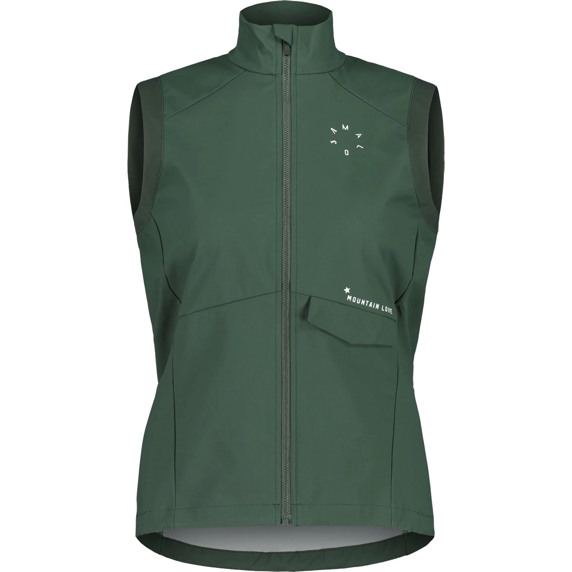 Die multifunktionale Weste bietet durch das Stormshell Light-Material an der Vorderseite und auf den Schultern guten Windschutz. Hoher Kragen, Bundweitenverstellung und eine Patten-Tasche fürs Smartphone, darüber Mountain Love-Schriftzug.