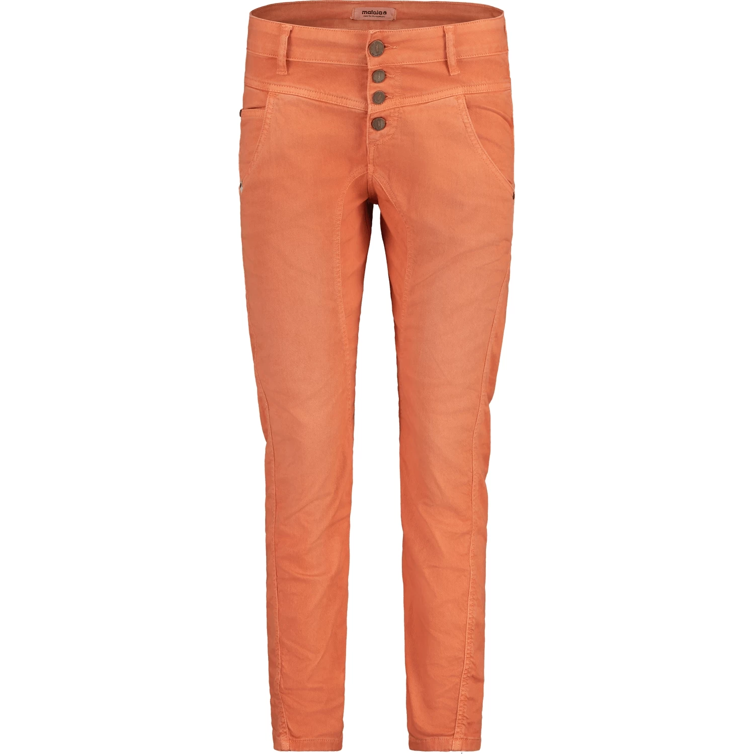 Garment Dye Pants mit gedrehter Seitennaht, zwei Eingriff-Taschen vorne sowie eine Coin Pocket, zwei aufgesetzte Gesäßtaschen, low waist fit und schmal zulaufendes Bein, auffällige Knopfleiste vorne. Kleines Maloja-Patch auf der rechten Gesäßtasche.