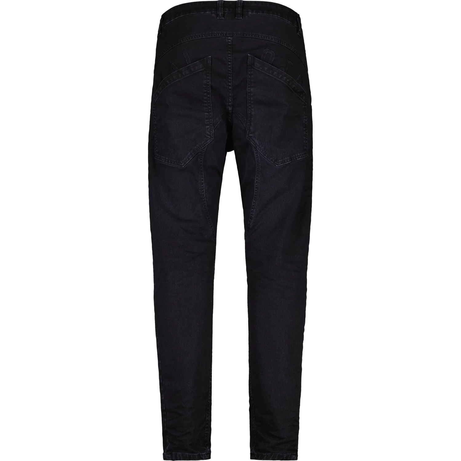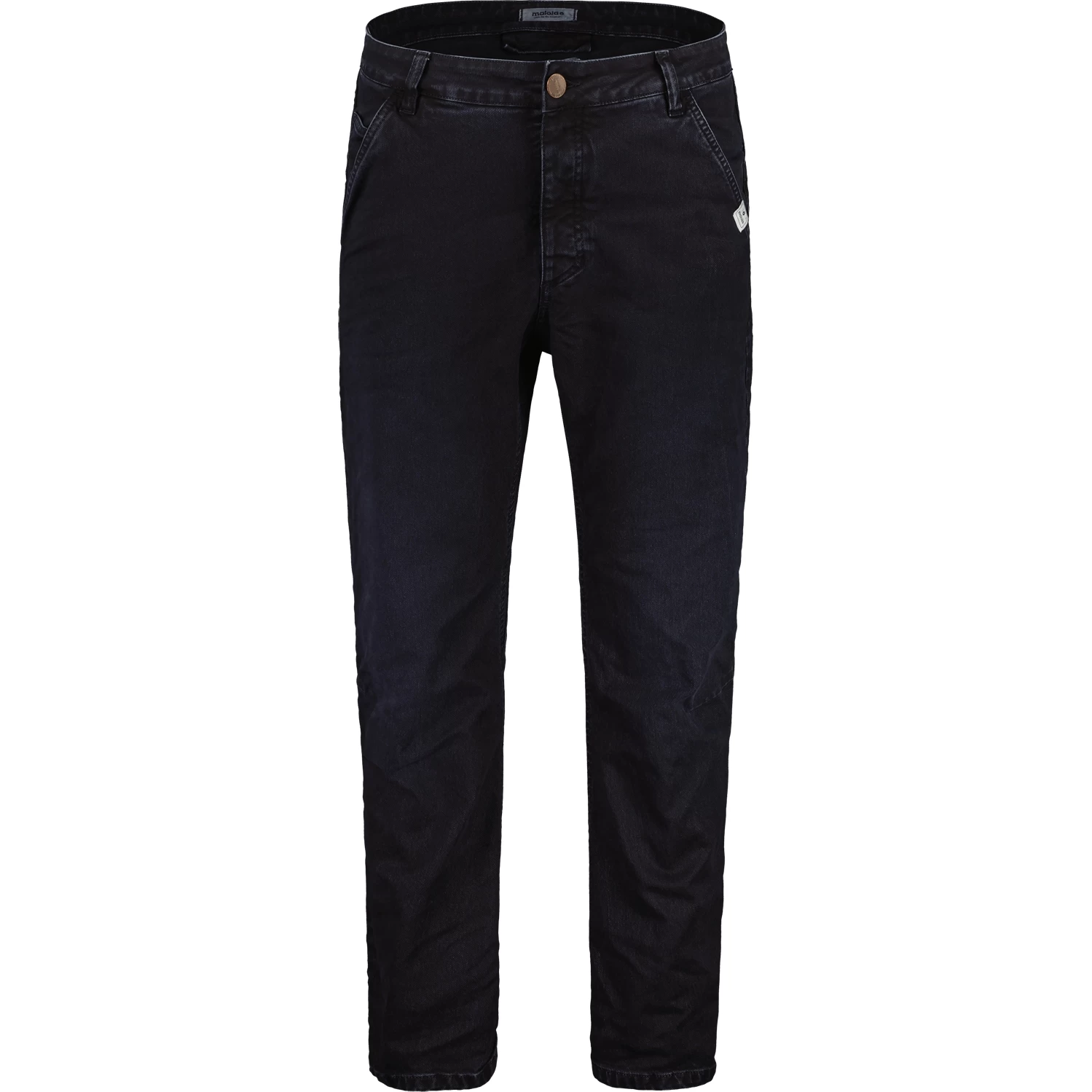 Locker geschnittene 5-Pocket-Pant aus Biobaumwolle, in einem Stück gefärbt. Zwei schräge Eingrifftaschen vorn mit zusätzlicher Coin-Pocket, zwei große aufgesetzte Gesäßtaschen mit Maloja-Stick darüber.
