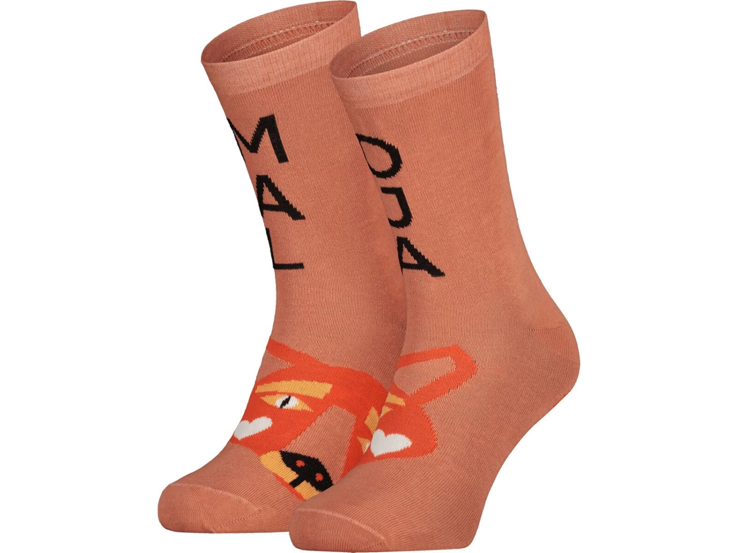 Socken in moderner Länge aus Baumwoll-Mix, geteilter Maloja-Schriftzug vorn und Tier-Motiv auf den Fußrücken.