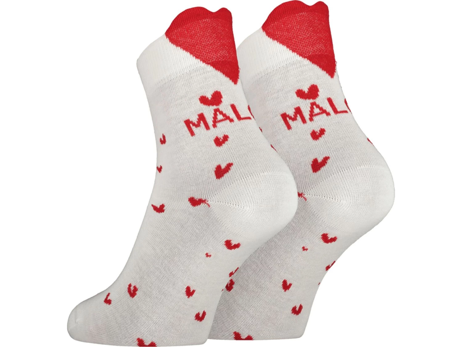 Herzige Socken aus Baumwoll-Mix – Mittellang, mit fliegenden Herzen, Bündchen mit eingearbeiteter Herz-Form hinten.