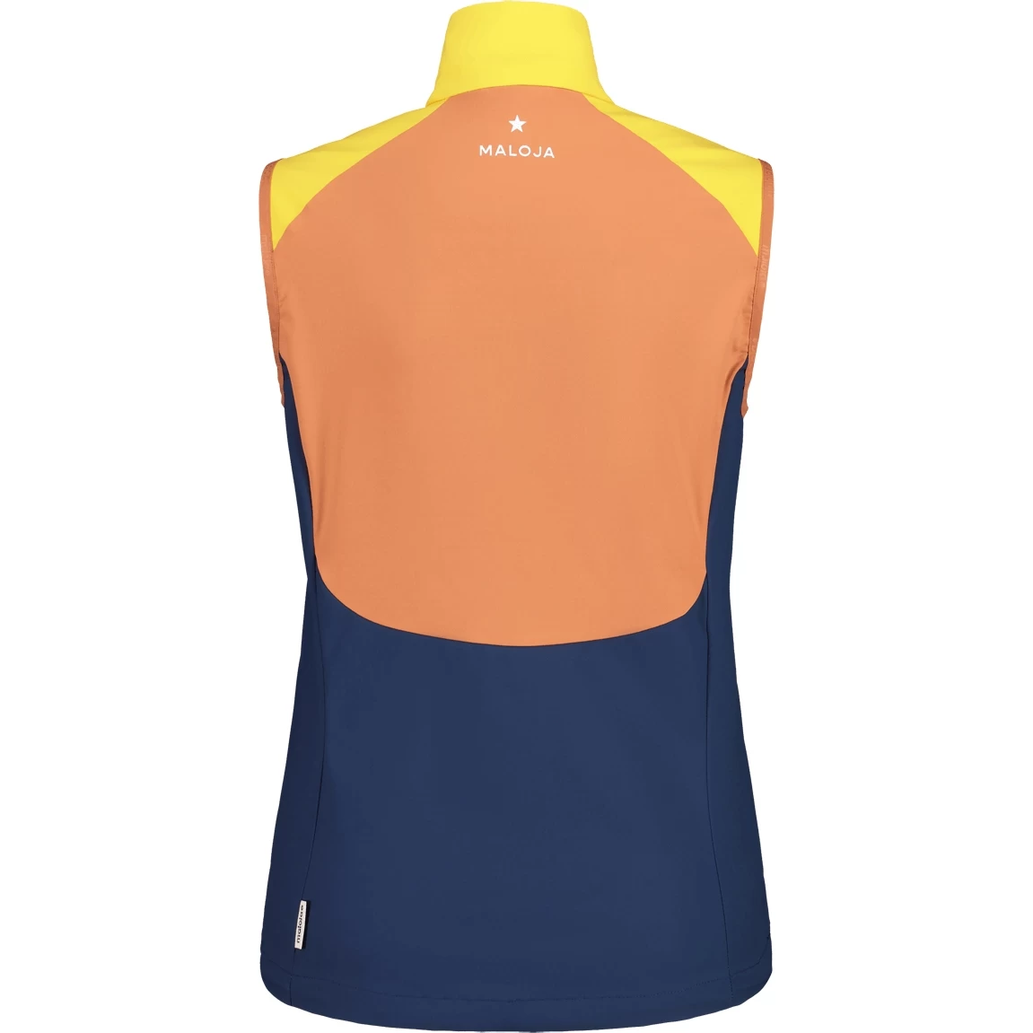 Die multifunktionale Weste bietet durch das Stormshell light Material an der Vorderseite und auf den Schultern guten Windschutz. Am hohen Kragen und dem oberen Brustbereich wird der Reißverschluss durch eine Patte mit Maloja-Schriftzug abgedeckt. Bundweitenverstellung und eine Zipper-Tasche fürs Smartphone. Sterndesign an der Schulter, Maloja-Schriftzug im Nacken.
