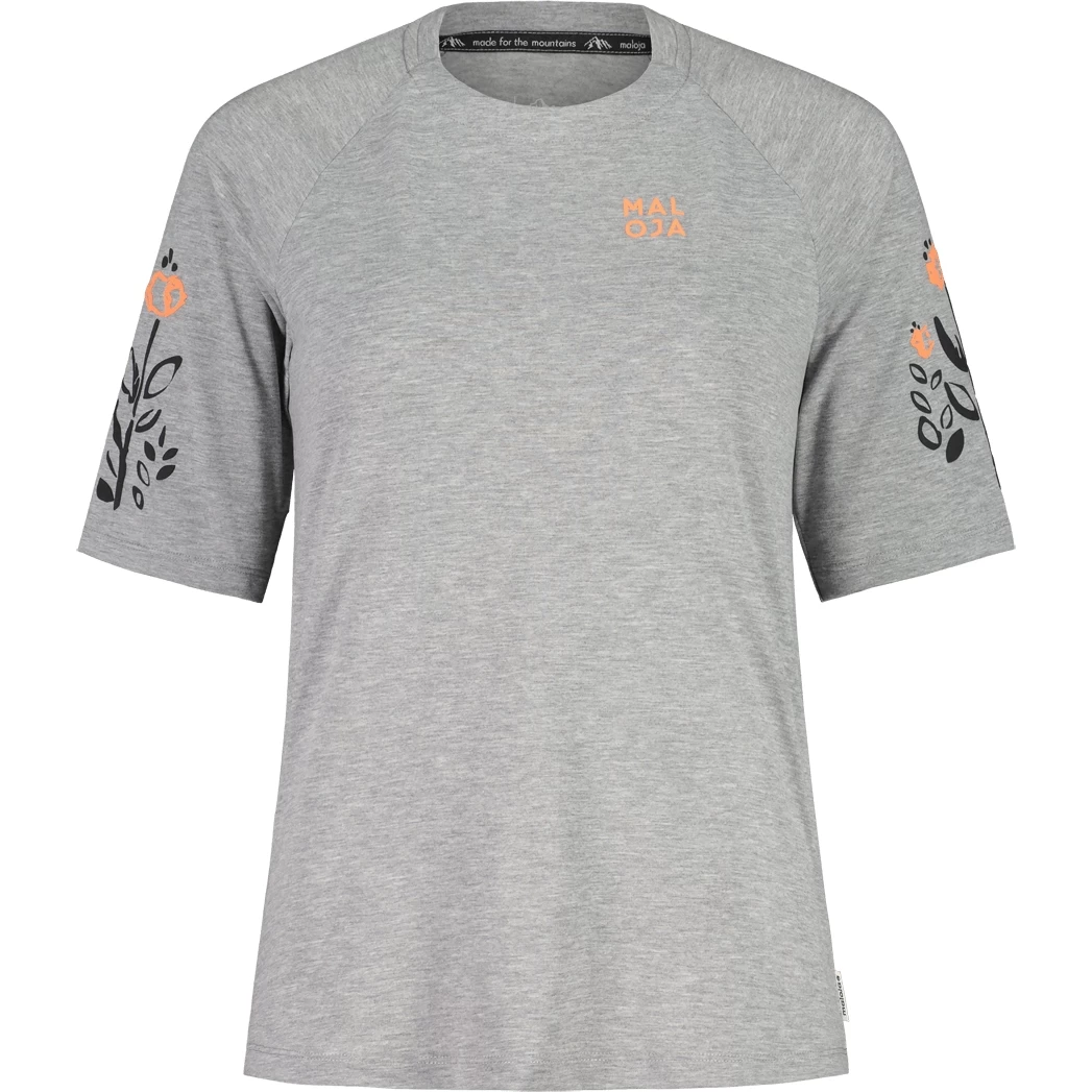 Das locker geschnittene Shirt besteht aus hochwertigem Naturalon, das schnell trocknet, sich dabei aber sehr natürlich greift und angenehm trägt. Die erhabenen floralen Rubberprints auf den Ärmeln und Maloja-Schriftzüge auf der Brust und im Nacken sind hübsche Designdetails.