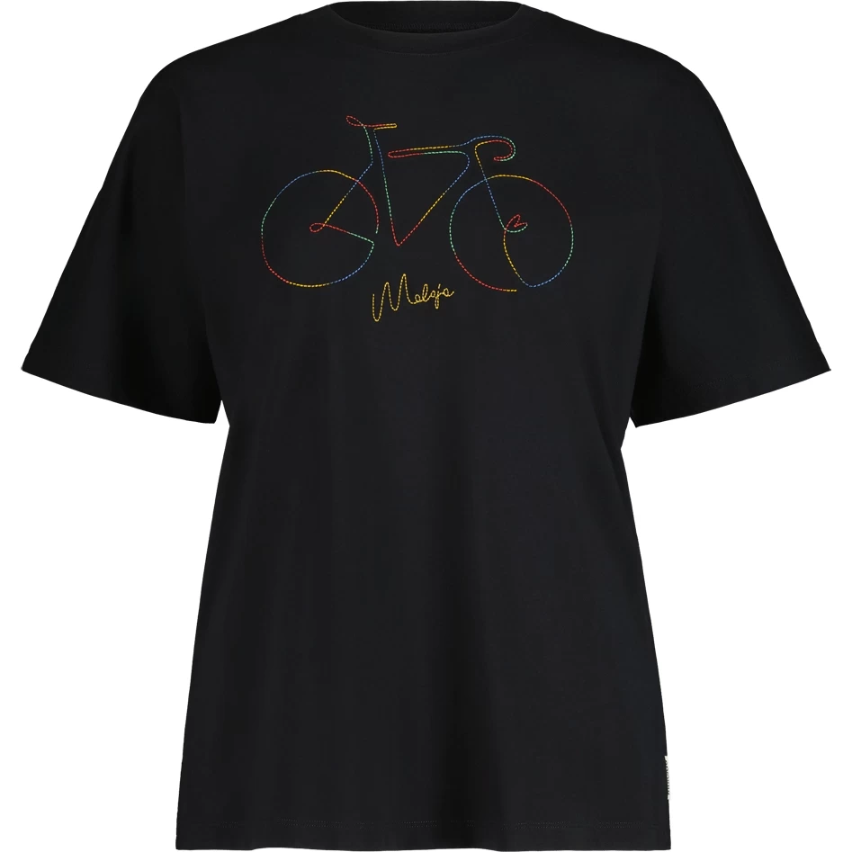Lässiges Basic-T-Shirt aus Biobaumwolle mit speziellem Regenbogengarn gesticktem Fahrrad, liebevoll integriertem Herz und handgeschriebenem Maloja-Schriftzug.
