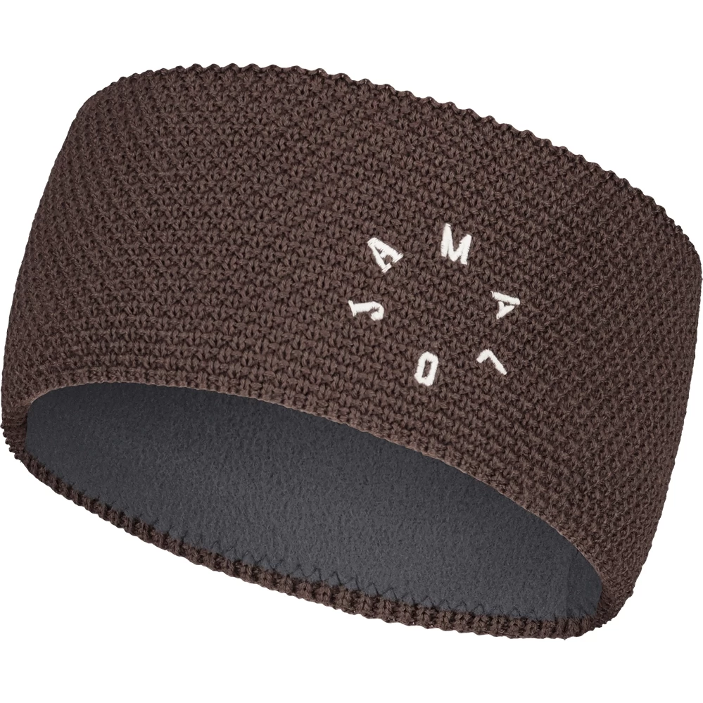 Grob gestricktes Stirnband aus Woll-Mix, innen warmes Fleece-Futter, mit gesticktem rundem Maloja-Schriftzug.