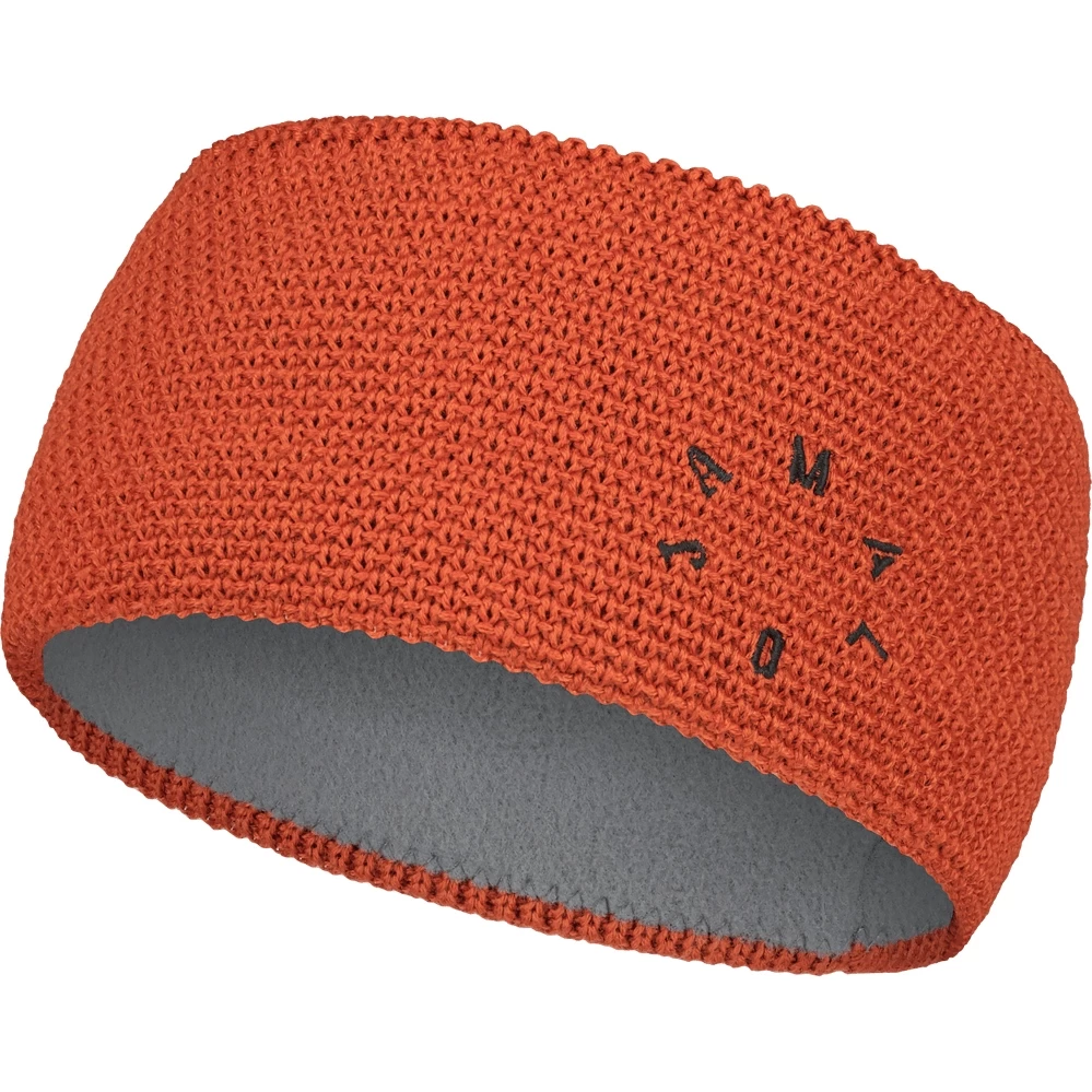 Grob gestricktes Stirnband aus Woll-Mix, innen warmes Fleece-Futter, mit gesticktem rundem Maloja-Schriftzug.