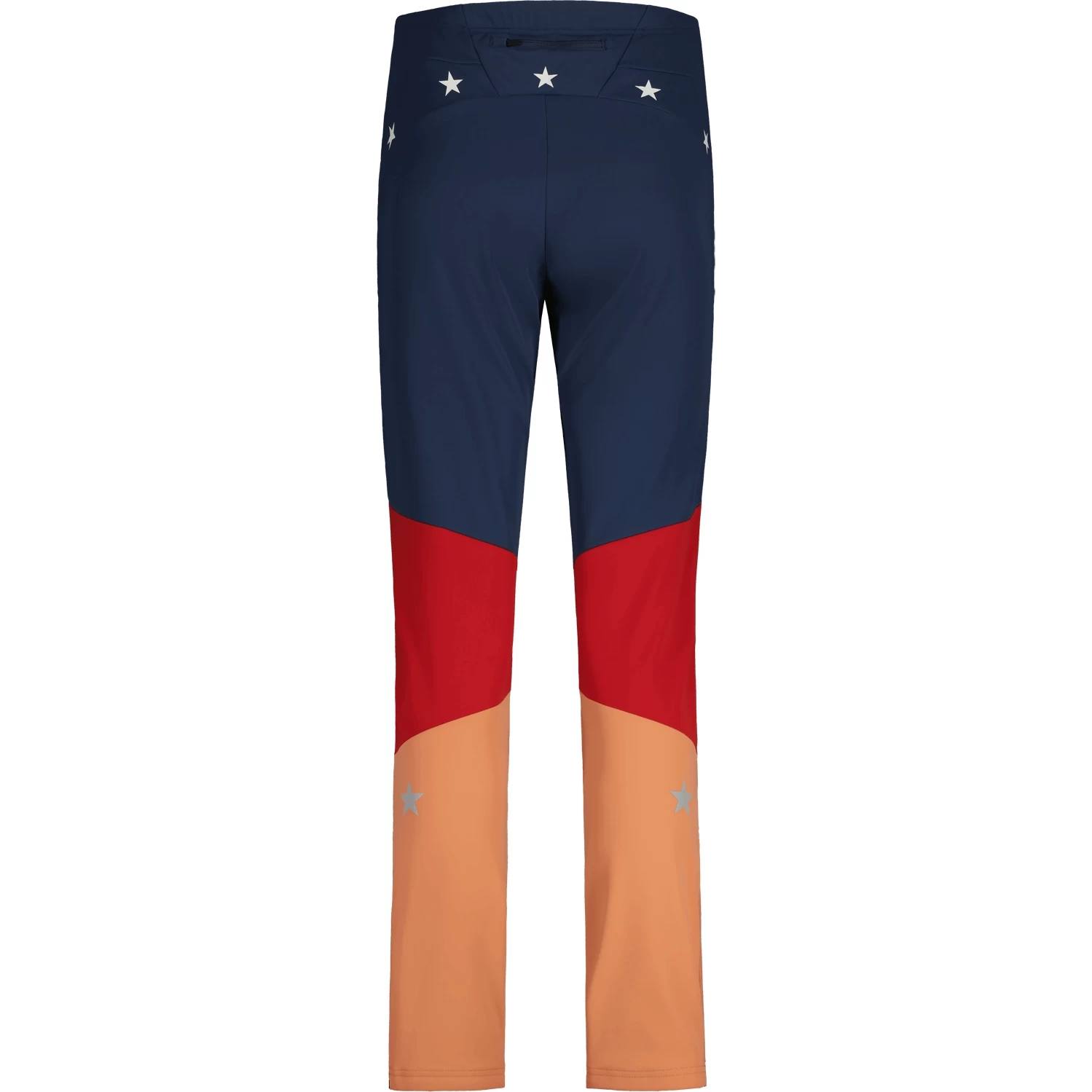 Das Stormshell-Material an der Front schützt gegen Wind, Thermal Stretch Eco an der Rückseite sorgt für Bewegungsfreiheit. Am Oberschenkel Belüftungsschlitze mit Zippern, seitliche Reißverschlüsse an den Beinöffnungen, Stern-Design an der Hüfte und den Beinen, reflektierende Details.