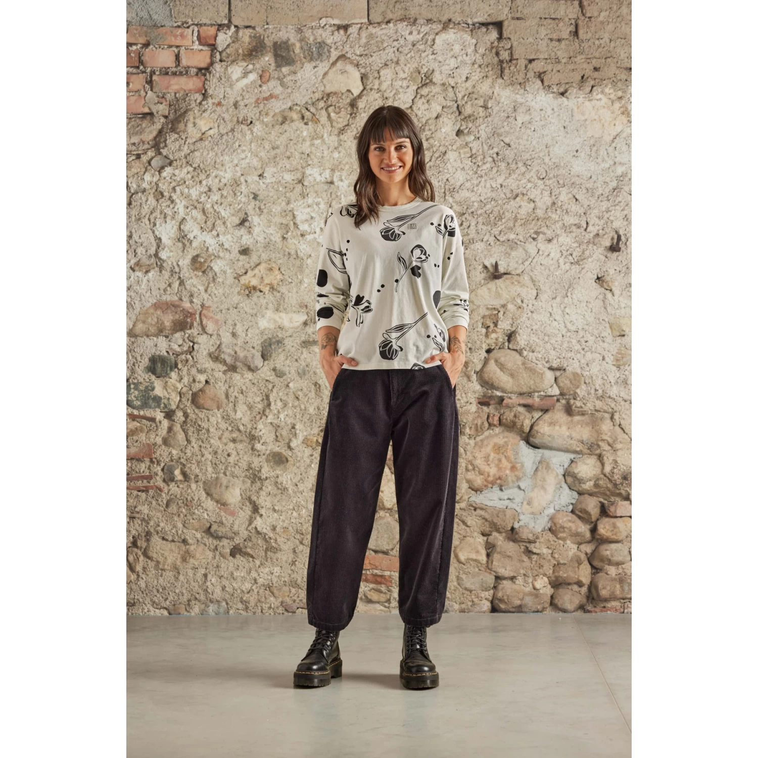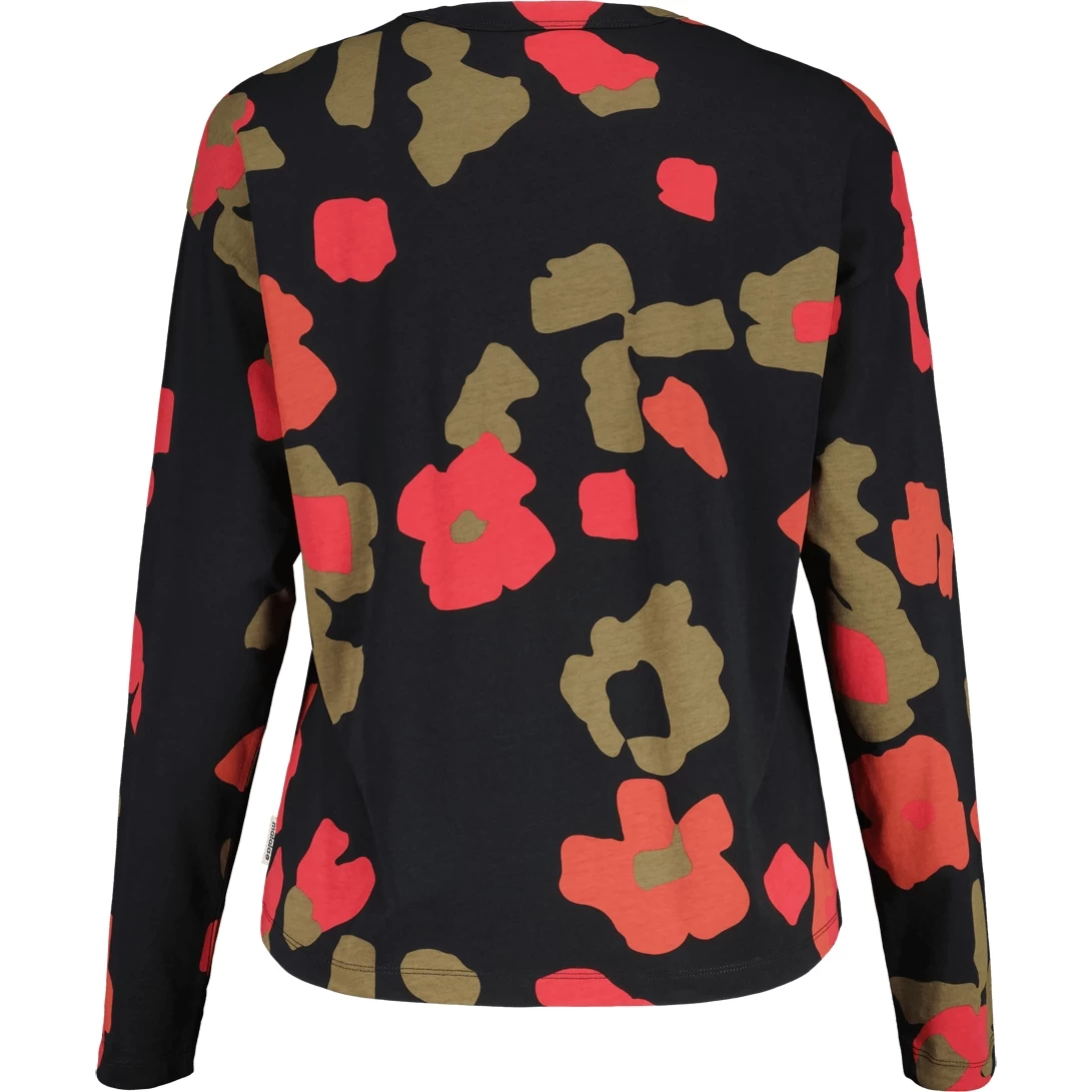 Locker geschnittenes Longsleeve aus Bio-Baumwolle mit überschnittenen Schultern und etwas weiterem Rundhalsausschnitt. Alpenblumen oder Primel-Allover-Prints, Maloja-Patch auf der Brust.