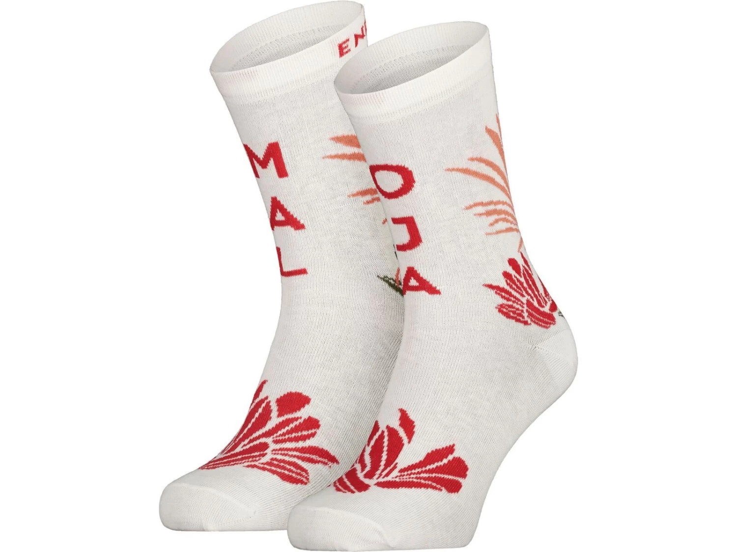 Socken in moderner Länge aus Baumwoll-Mix mit Allover Blumen-Motiv, geteilter Maloja-Schriftzug vorn.