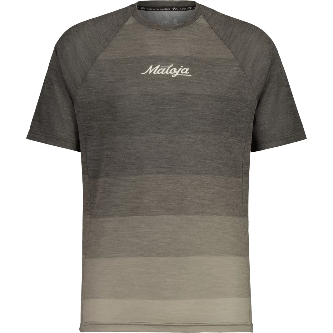 Eng Multisport-Undershirt für Männer aus Merino-Gewebe, schnell trocknend und mit guter Wärmeisolierung, mit Allover-Farbverlauf oder Bergsilhouette. Maloja-Schriftzug auf der Brust.