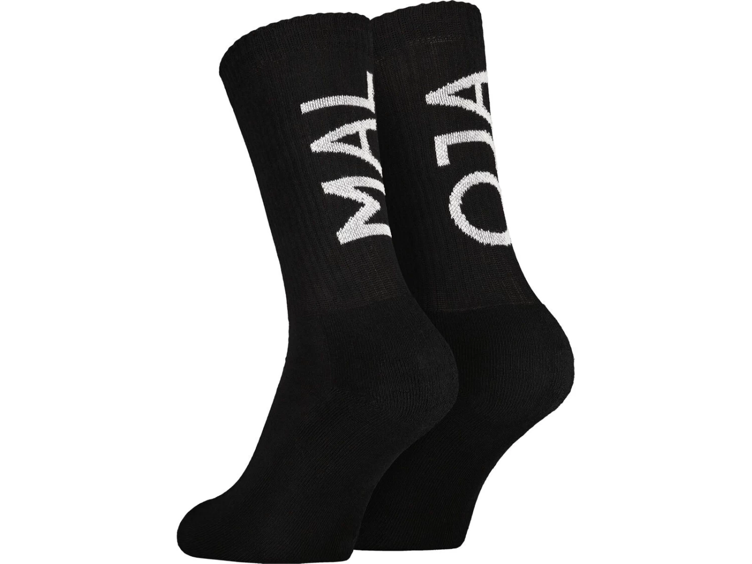 Socken in moderner Länge aus Baumwoll-Mix, geteilter Maloja-Schriftzug hinten.