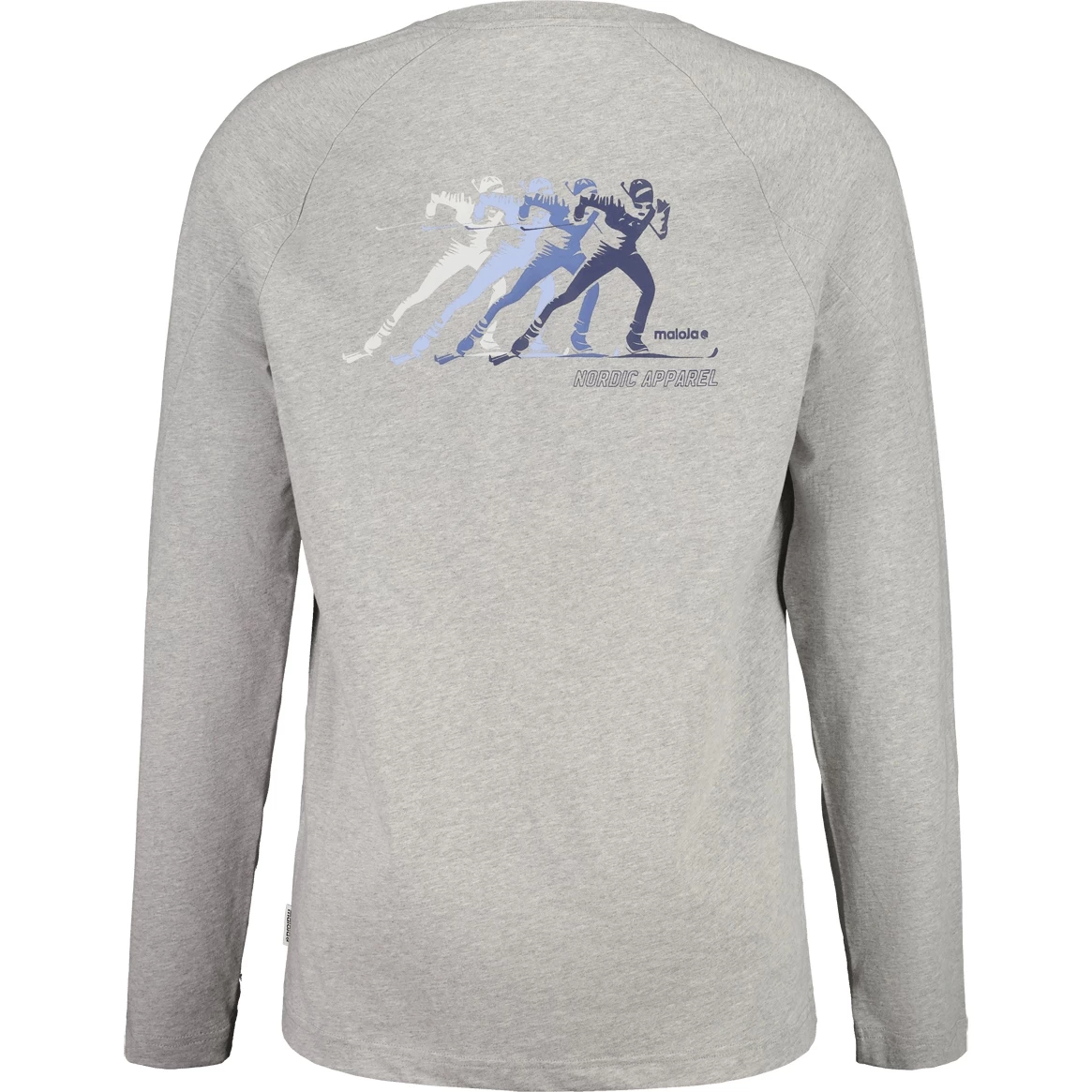 Langarmshirt aus Bio-Baumwolle mit modernem Design: Raglan-Ärmel und angesetzte Rippbündchen am Kragen und den Ärmeln. Großer Langlauf-Print auf dem Rücken, Maloja-Patch auf der Brust.