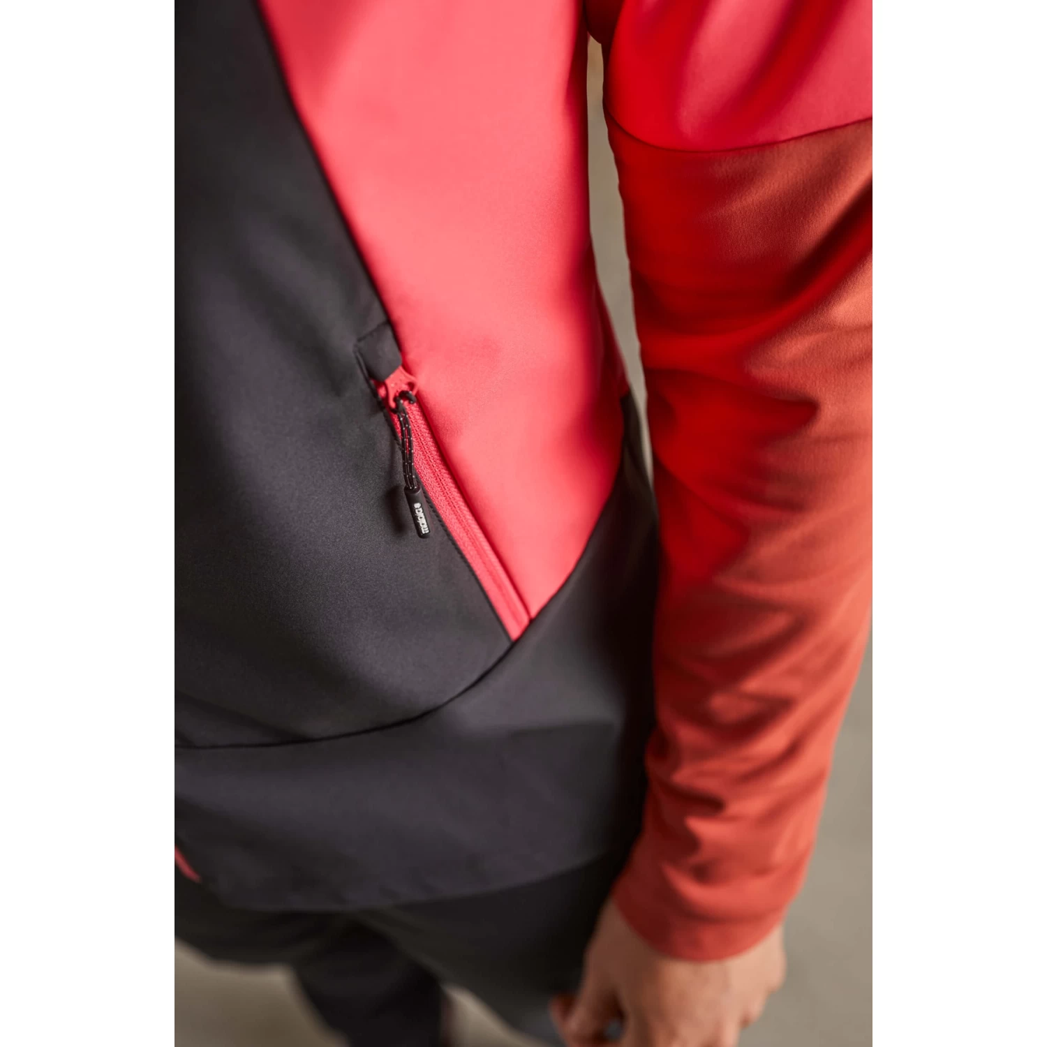Zwei seitliche Zipper-Taschen, rechteckige Maloja-Schriftzug auf der Brust, Glide&Ride-Patch auf dem rechten Arm.