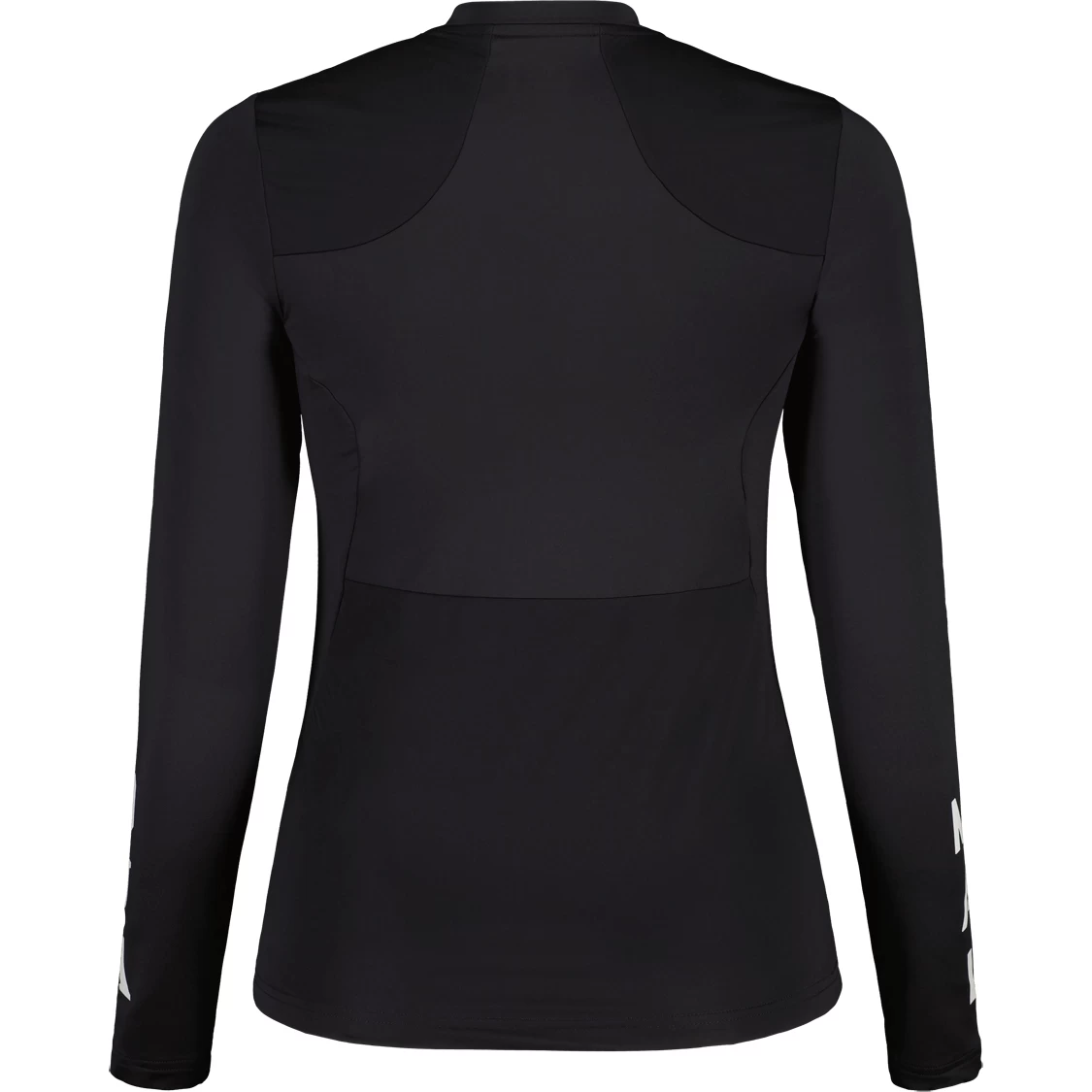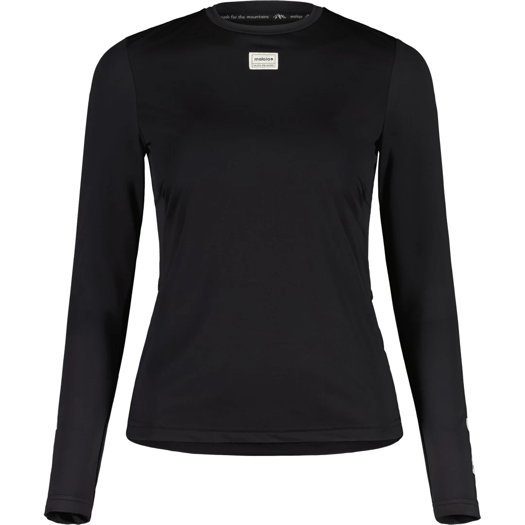 Eng geschnittenes, bi-elastisches Multisport-Undershirt für Frauen aus schnell trocknendem Polyester, die Front ist winddicht, großteils recyceltes Material. Geteilter Maloja-Schriftzug auf den Unterarmen.